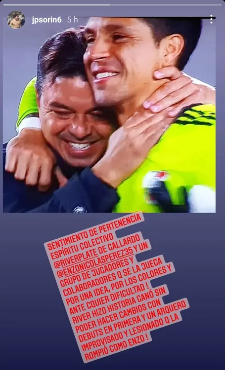 Juan Pablo Sorín: "Sentimiento de pertenencia, espíritu colectivo, River de Gallardo. Enzo Pérez y un grupo de jugadores y colaboradores que se la juega por una idea, por los colores y ante cualquier dificultad. River hizo historia, ganó sin poder hacer cambios, con debuts en primera y un arquero improvisado y lesionado que la rompió como Enzo".