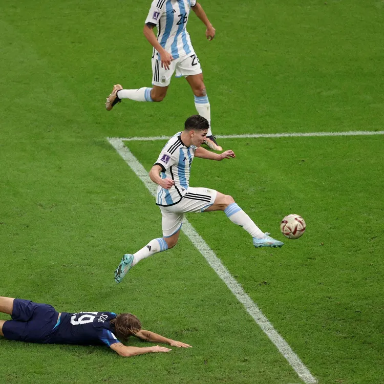 Julián en el primer gol pasó por delante a 4 defensores croatas como una topadora, y cuando definió mano a mano con el arquero también se lo llevó puesto. Ya en el segundo, tras una gran jugada del capitán argentino que avanzó por la banda derecha del campo y al llegar al área, apretado contra la línea final, se la pasó a la Araña que marcó su cuarto gol en la Copa.