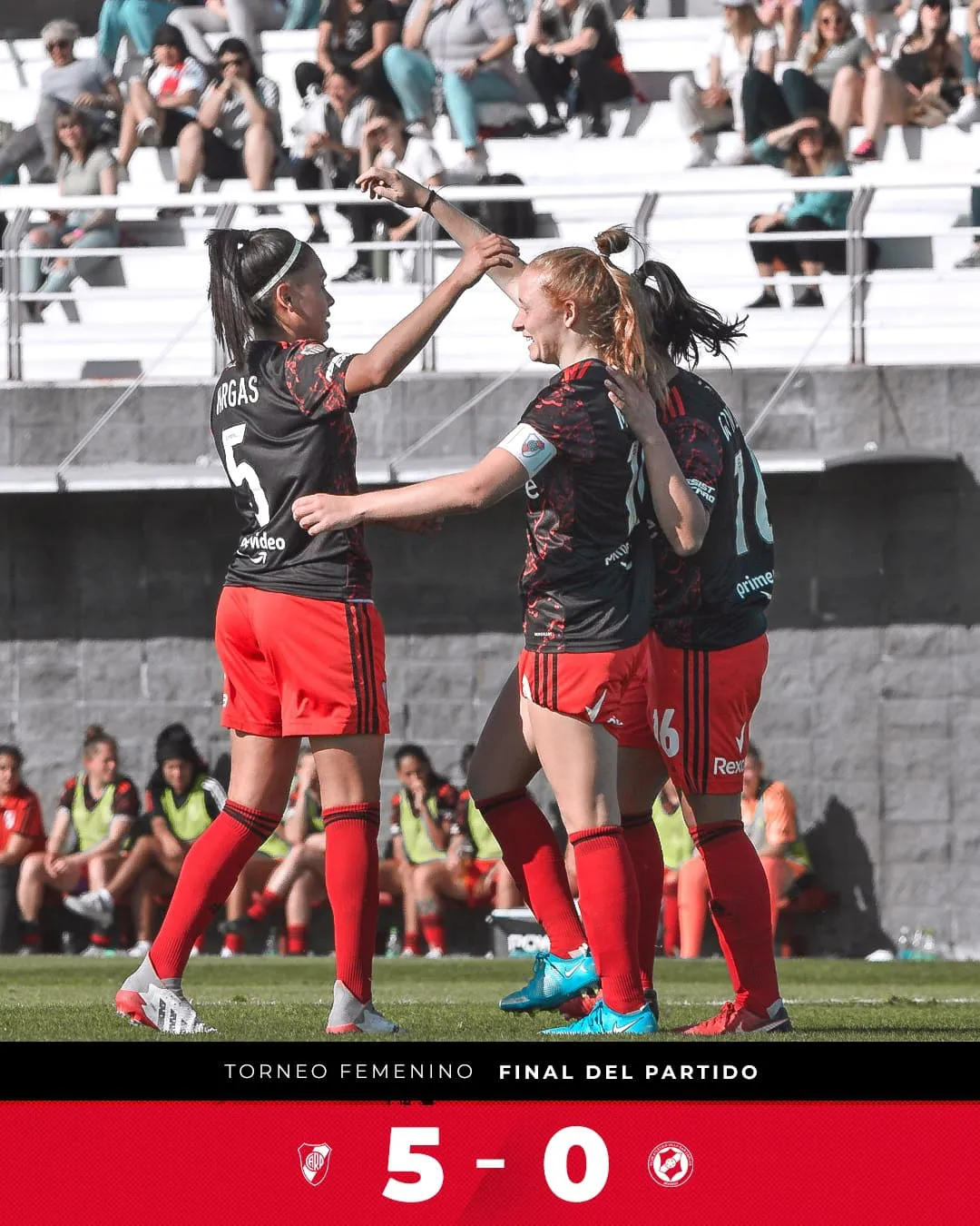 El Millonario se fue al entretiempo ganando por 2-0. El primer tanto, lo marcó la capitana Justina Morcillo, mientras que el segundo llegó a través de Bebo Pereyra tras un gran pase de Carolina Birizamberri. En el segundo tiempo, estiraron el marcador: Gavy Santos desde un tiro libre, Holzheier luego de un pase de Lonigro, y esta última convirtió el quinto para redondear una jornada perfecta.