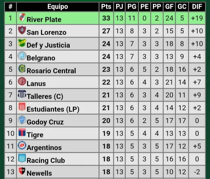 Tercero están Defensa y Justicia, y Belgrano con 24 unidades, que le ganó a Newell's y sube en la tabla. Y reemplaza a Rosario Central que hasta hace unos días estaba tercero, pero al empatar con Boca bajó una posición y ahora tiene un punto menos que el Pirata. Quinto se encuentra Lanús a once unidades del conjunto de Núñez. Sexto a doce están Talleres, y Estudiantes.