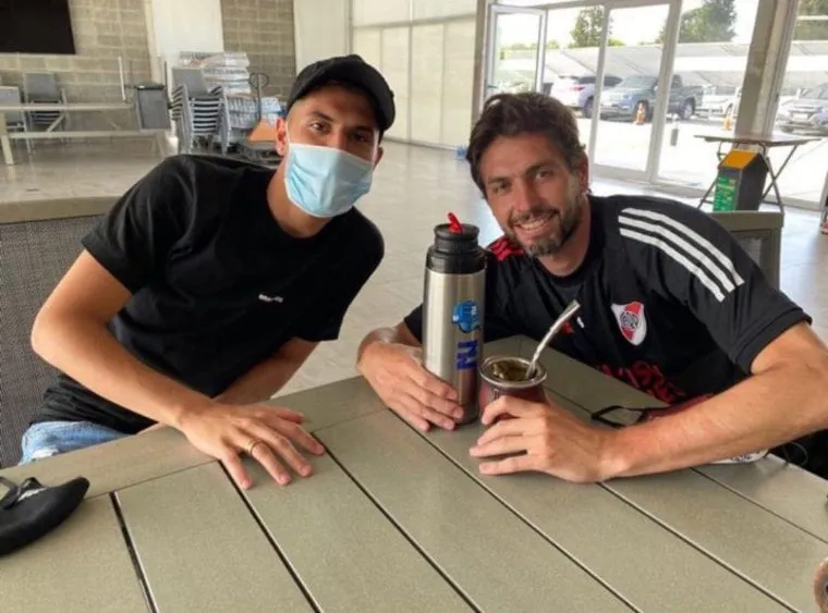 Palacios está realizando su recuperación en el predio de la AFA en Ezeiza, y al estar cerca del River Camp, decidió pasar a visitar a sus ex compañeros. Poroto Lux compartió en sus redes una foto junto Palacios, donde chicaneó que estaba aprendiendo alemán.