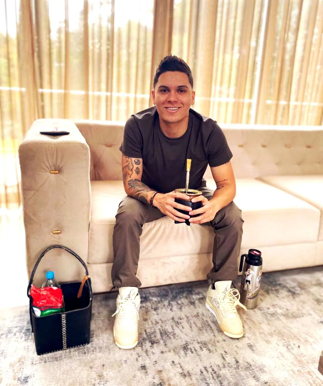 En los últimos días el "panita" publicó una foto en su cuenta de instagram en la que se lo ve tomando mates sentado en un sofá y su termo al lado del pie izquierdo, esa gloriosa pierna izquierda, y si nos detenemos a mirar el decorado, podemos ver varios stickers de su paso por River.